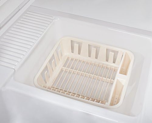 H white plastic dish drainer.